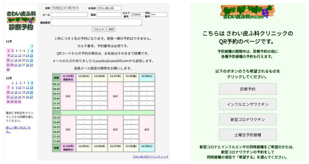 QRコードを読み込むと、通常は下の画像の左の診察予約画面に切り